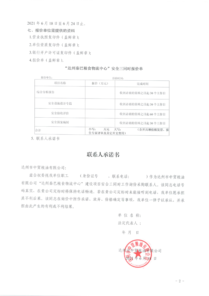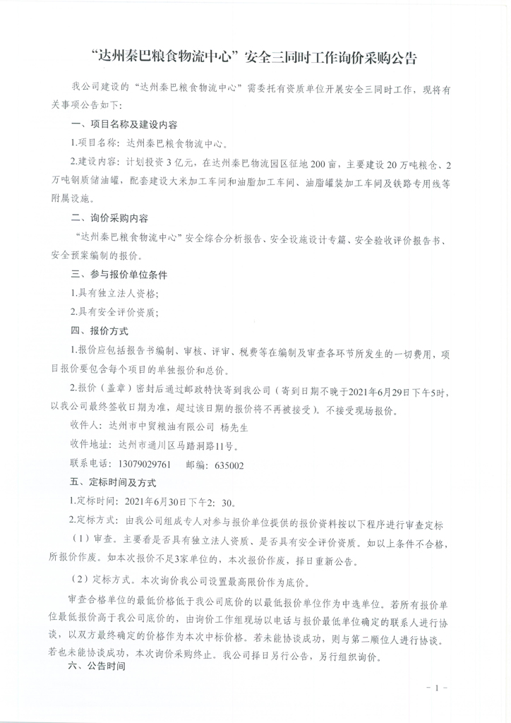 达州秦巴粮食物流中心安全三同时工作询价采购